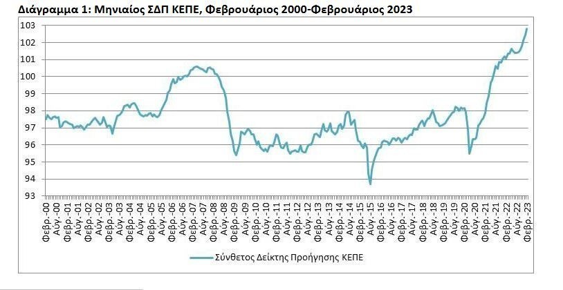 Εξάλλου, ο σύνθετος δείκτης προήγησης (ΣΔΠ) του ΚΕΠΕ για τον Φεβρουάριο του 2023 σημείωσε άνοδο για έκτη συνεχόμενη περίοδο, φτάνοντας σε νέο ανώτατο επίπεδο για το σύνολο της περιόδου εξέτασης. Η εν λόγω εξέλιξη αποτελεί συνέχεια της συνολικά ανοδικής πορείας που ακολουθεί ο ΣΔΠ από τα μέσα του 2020 και έπειτα.