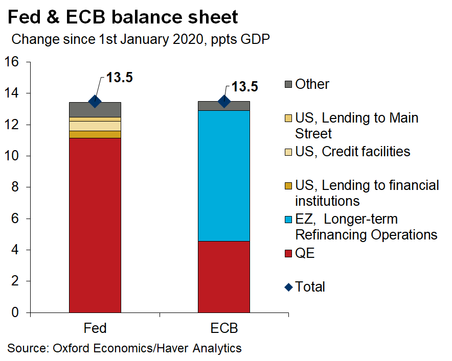 Το 2020 είναι μια χρονιά που η ΕΚΤ έσβησε την απόσταση από την Fed όπως δείχνει το παραπάνω γράφημα της Oxford Economics, καθώς οι τράπεζες έχουν αξιοποιήσει το εργαλείο του δωρεάν χρήματος για δάνεια αναχρηματοδότησης.