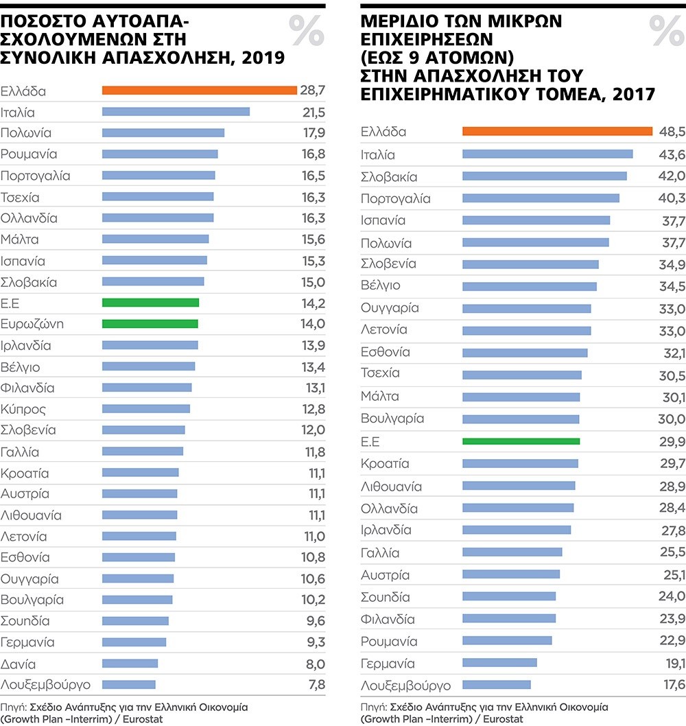 ■ Η Ελλάδα είναι μακράν η χώρα με τους περισσότερους αυτοαπασχολουμένους. Πάνω από το 28% των εργαζομένων δουλεύουν μόνοι τους (διάγραμμα 1).