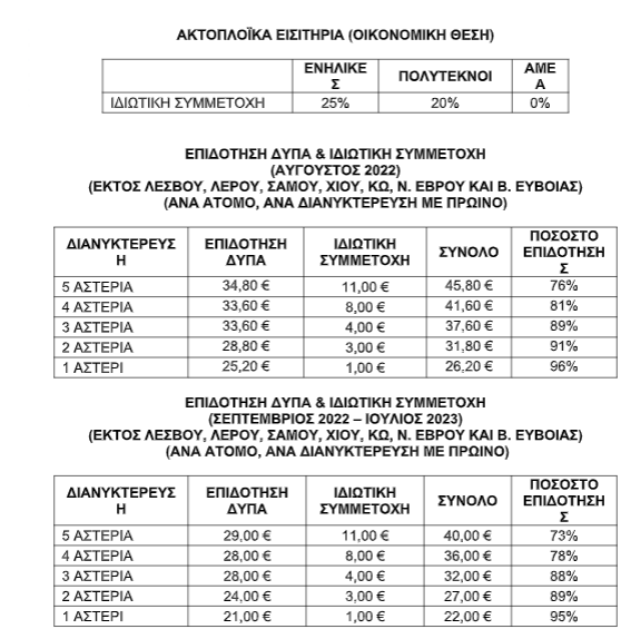Εκτός από τη διαμονή σε τουριστικά καταλύματα επιδοτούνται και ακτοπλοϊκά εισιτήρια. Η συμμετοχή της γενικής κατηγορίας των δικαιούχων ανέρχεται σε 25%.
