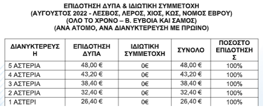 Και στο νέο πρόγραμμα ισχύουν αυξημένες τιμές επιδότησης, οι οποίες αφορούν σε όλες τις κατηγορίες καταλυμάτων, ώστε να καλυφθεί το αυξημένο κόστος και να εξασφαλιστεί μεγάλη συμμετοχή.