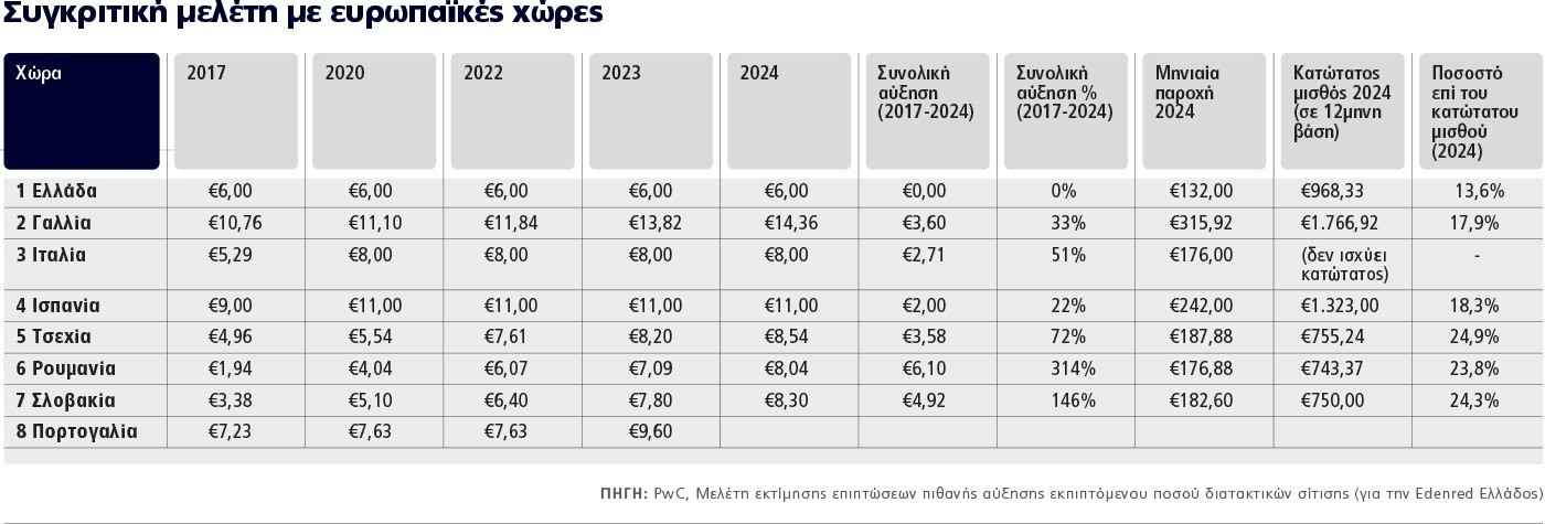 Πού οδηγεί αυτό; Στην Ελλάδα, η μηνιαία παροχή αναλογεί μόλις στο 13,6% του κατώτατου μισθού, όταν ο μέσος όρος στις υπό εξέταση άλλες χώρες ήταν 21% το 2024. Επιπλέον στη χώρα μας, όμως, εδώ και δεκαετίες αυξήσεις βλέπουν κυρίως όσοι αμείβονται με τον κατώτατο μισθό, ενώ εργαζόμενοι με μεσαίες και υψηλότερες αποδοχές δεν βλέπουν ούτε άμεσες αυξήσεις στον μισθό τους ούτε όμως και αύξηση στις παροχές σίτισης από τον εργοδότη τους.