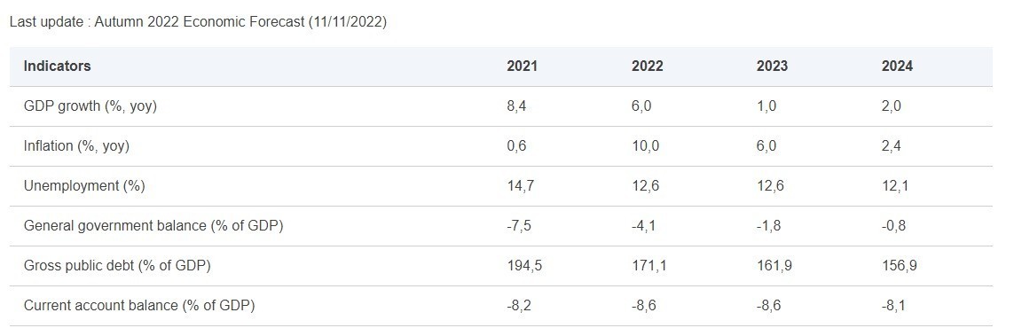 Το δημοσιονομικό έλλειμμα, ταυτόχρονα, προβλέπεται να φτάσει το -4,1% φέτος, καθώς και να περιοριστεί στο -1,8% το 2023 και στο -0,8% το 2024. Το δημόσιο χρέος, από την πλευρά του, αναμένεται να καθοριστεί στο 171,1% του ΑΕΠ το 2022 (το υψηλότερο σε όλη την Ευρωζώνη), στο 161,9% το 2023 και στο 156,9% το 2024.