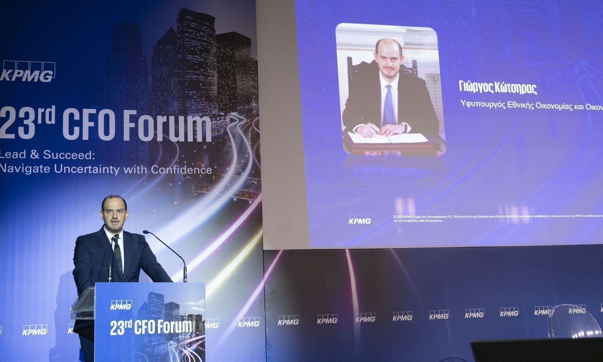 «Η διατήρηση της αναπτυξιακής προοπτικής της ελληνικής οικονομίας και η ενίσχυση της ανθεκτικότητάς της έναντι της αυξανόμενης διεθνούς αβεβαιότητας είναι το μεγάλο στοίχημα για το επόμενο διάστημα», τόνισε ο Υφυπουργός Εθνικής Οικονομίας και Οικονομικών, Γιώργος Κώτσηρας, περιγράφοντας τις προτεραιότητες της οικονομικής και φορολογικής πολιτικής, σε ομιλία του σήμερα Πέμπτη στο 23ο CFO Forum της KPMG, με κεντρικό μήνυμα “Lead & Succeed: Navigate Uncertainty with Confidence”.