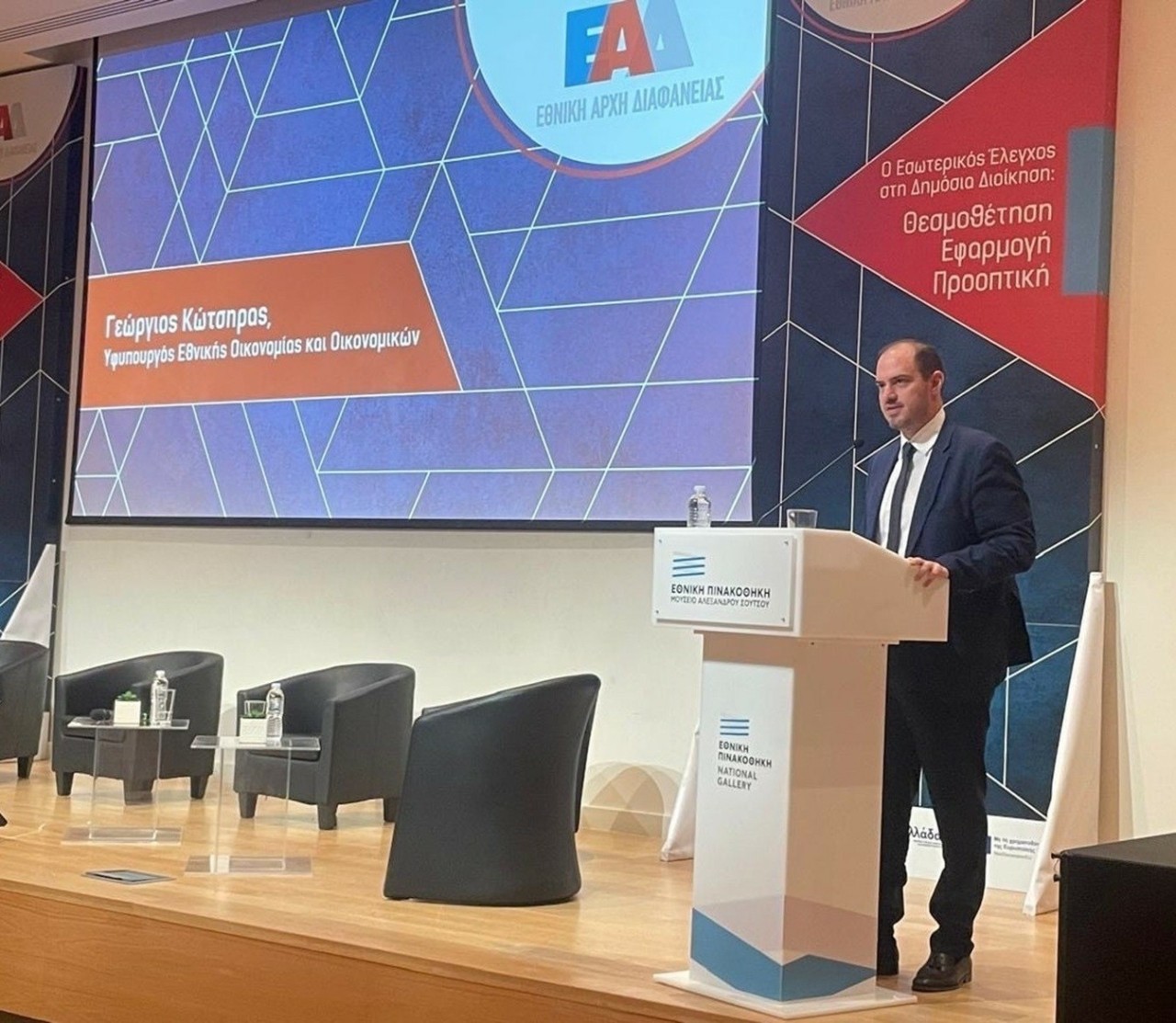 Τον ρόλο του εσωτερικού ελέγχου στη δημοσιονομική υπευθυνότητα και στην ενίσχυση της φορολογικής δικαιοσύνης ανέδειξε ο Υφυπουργός Εθνικής Οικονομίας και Οικονομικών, Γιώργος Κώτσηρας, απευθύνοντας σήμερα Πέμπτη 26 Ιουνίου χαιρετισμό, και εκ μέρους του Υπουργού Κυριάκου Πιερρακάκη, σε ημερίδα της Εθνικής Αρχής Διαφάνειας, όπου παρουσιάστηκε η Έκθεση για την εφαρμογή του μέρους Α’ του ν. 4795/2021 για το Σύστημα Εσωτερικού Ελέγχου σε φορείς του Δημοσίου Τομέα.