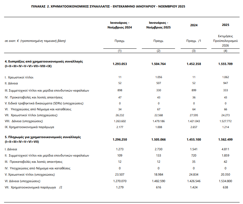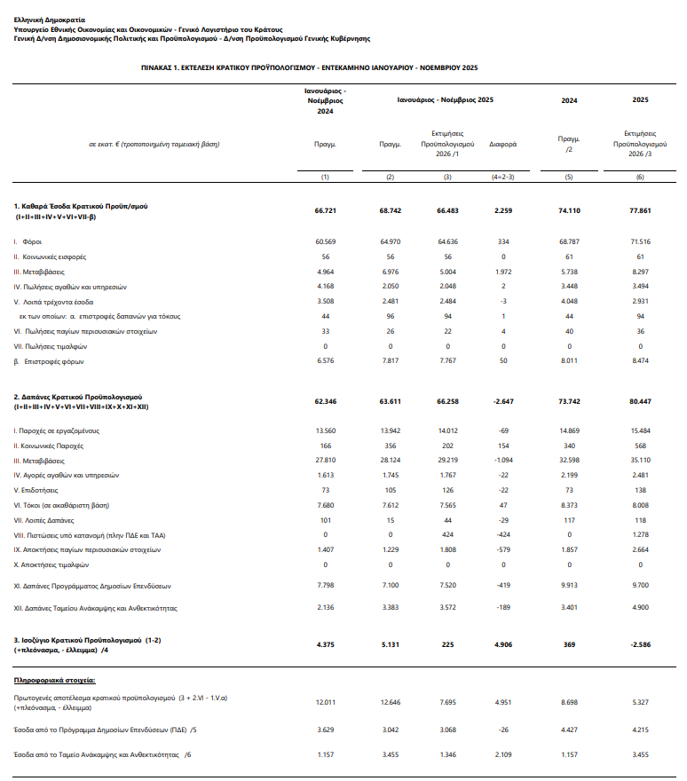 Αναφορικά με την παρατηρούμενη διαφορά έναντι των στόχων στο σκέλος των εσόδων, σημειώνεται ότι κατά κύριο λόγο οφείλεται στην είσπραξη στις 26 Νοεμβρίου, ποσού ύψους 2.109 εκατ. ευρώ από το Ταμείο Ανάκαμψης και Ανθεκτικότητας, που είχε προβλεφθεί για είσπραξη τον μήνα Δεκέμβριο 2025 και συνεπώς στο επόμενο δελτίο του Δεκεμβρίου 2025, η ανωτέρω παρατηρούμενη διαφορά, θα έχει εξισορροπηθεί. Εξαιρουμένου του ανωτέρω ποσού τα καθαρά έσοδα παρουσιάζουν αύξηση κατά 150 εκατ. ευρώ έναντι του στόχου που έχει περιληφθεί στην εισηγητική έκθεση του Προϋπολογισμού 2026.
