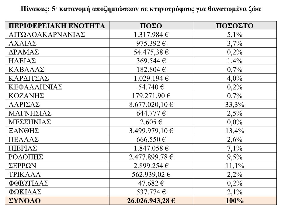 Συγκεκριμένα, με την 5η κατανομή καταβλήθηκαν στις πληγείσες Περιφέρειες 26.026.943,28€ ώστε να προχωρήσουν άμεσα σε πληρωμές προς τους κτηνοτρόφους. Η νέα κατανομή αποζημιώσεων ενισχύει εκ νέου τη Θεσσαλία, η οποία λαμβάνει το 33% (10.913.930,12 €), και κυρίως τη Λάρισα (8.677.020,10 €).