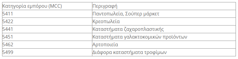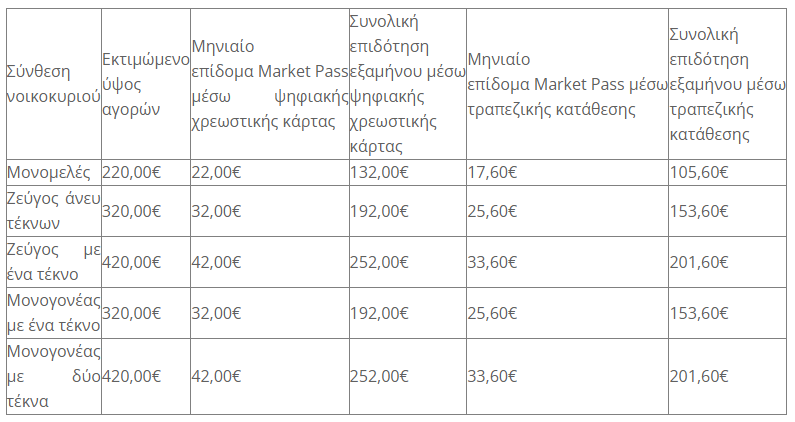 «Η ενίσχυση ανέρχεται στο 10% επί του ύψους των αγορών ειδών κάθε είδους στα καταστήματα που δραστηριοποιούνται στο λιανικό εμπόριο τροφίμων και έως συγκεκριμένα όρια τα οποία ξεκινούν από 220 ευρώ για το μονομελές νοικοκυριό αυξανόμενο κατά 100 ευρώ για κάθε επιπλέον μέλος, με ανώτατο όριο τα 1000 ευρώ αγορές».