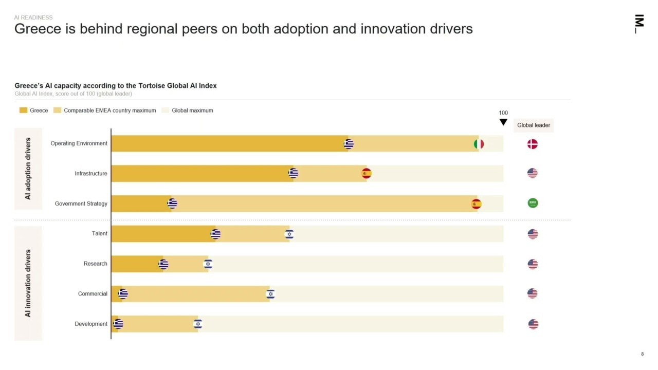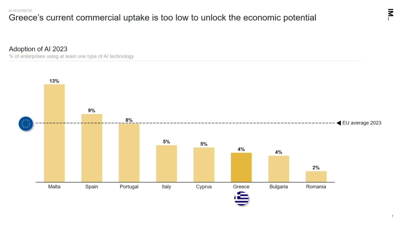 Όπως διαπίστωσε η έρευνα, η Ελλάδα έχει μείνει πίσω στην υιοθέτηση λύσεων παραγωγικής τεχνητής νοημοσύνης, κυρίως σε σχέση με άλλες ανεπτυγμένες οικονομίες.