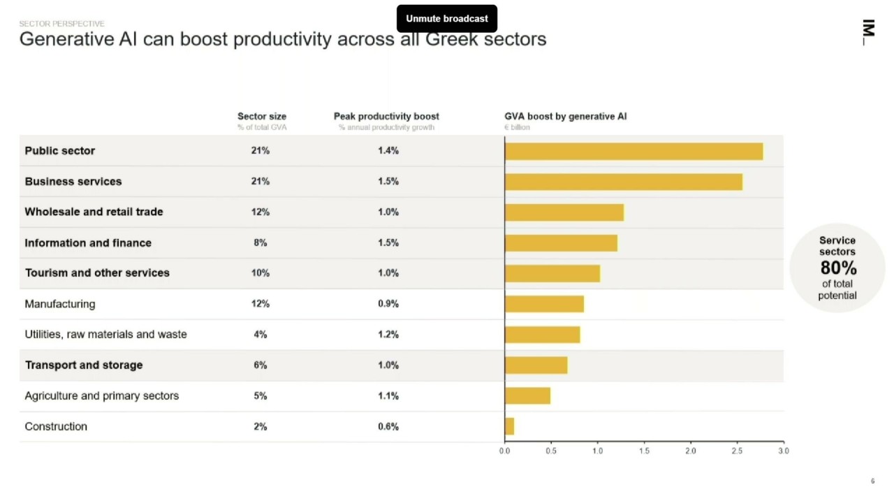Οι κυριότεροι τομείς όπου η παραγωγική ΤΝ μπορεί να δημιουργήσει τη μεγαλύτερη αλλαγή είναι ο δημόσιος τομέας, οι υπηρεσίες, ο τουρισμός και το εμπόριο.