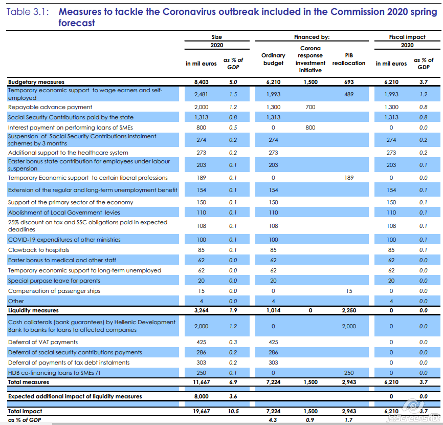 Τι αποκαλύπτει αυτός ο πίνακας; Ότι μέχρι τις 23 Απριλίου που αναρτήθηκε ο πίνακας με τις εαρινές προβλέψεις της Κομισιόν τα μέτρα για την Οικονομία εντός του 2020 φτάνουν στα 20 δισ. (19,667 δισ. για την ακρίβεια). Και περιλαμβάνει μόνο τα μέτρα που ανακοινώθηκαν μέχρι πριν τρεις εβδομάδες και όχι όσα ανακοινώθηκαν μέσα στον Μάιο, όπως οι μειώσεις ΦΠΑ ή φόρων για τους ιδιοκτήτες ακινήτων κλπ.