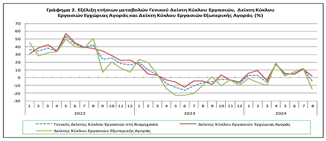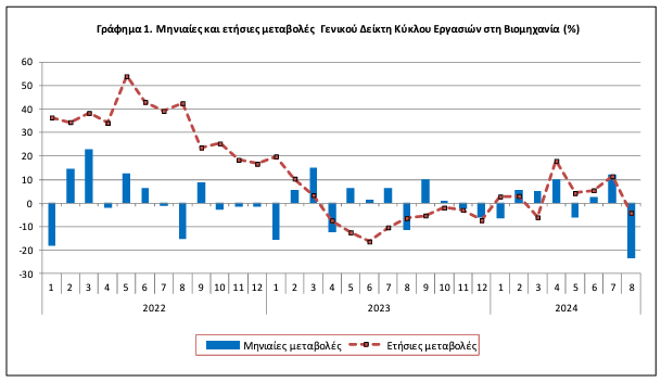 Ο Γενικός Δείκτης Κύκλου Εργασιών στη Βιομηχανία (σύνολο εγχώριας και εξωτερικής αγοράς) του μηνός Αυγούστου 2024, σε σύγκριση με τον αντίστοιχο δείκτη του Αυγούστου 2023, παρουσίασε μείωση 4,1% έναντι μείωσης 6,4% που σημειώθηκε κατά την αντίστοιχη σύγκριση του έτους 2023 με το 2022.