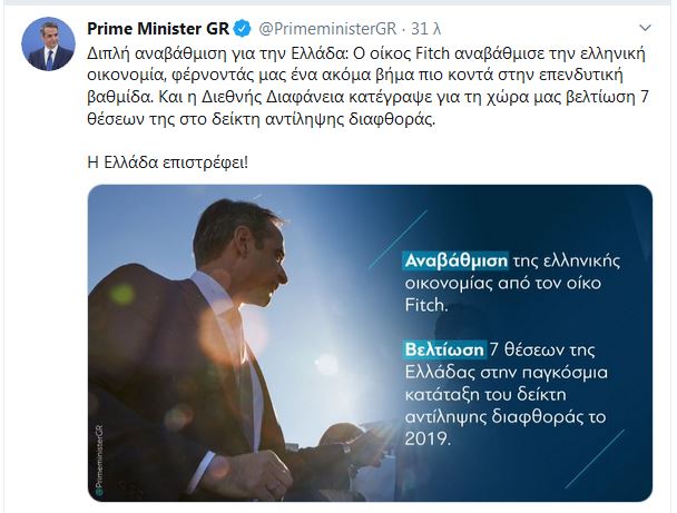 «Διπλή αναβάθμιση για την Ελλάδα: Ο οίκος Fitch αναβάθμισε την ελληνική οικονομία, φέρνοντάς μας ένα ακόμα βήμα πιο κοντά στην επενδυτική βαθμίδα. Και η Διεθνής Διαφάνεια κατέγραψε για τη χώρα μας βελτίωση 7 θέσεων της στο δείκτη αντίληψης διαφθοράς. Η Ελλάδα επιστρέφει!», αναφέρει σε ανάρτησή του στο twitter ο πρωθυπουργός Κυριάκος Μητσοτάκης για την αναβάθμιση της ελληνικής οικονομίας από τον οίκο αξιολόγησης Fitch και τη βελτίωση της θέσης της χώρας στον δείκτη αντίληψης διαφθοράς της Διεθνούς Διαφάνειας.