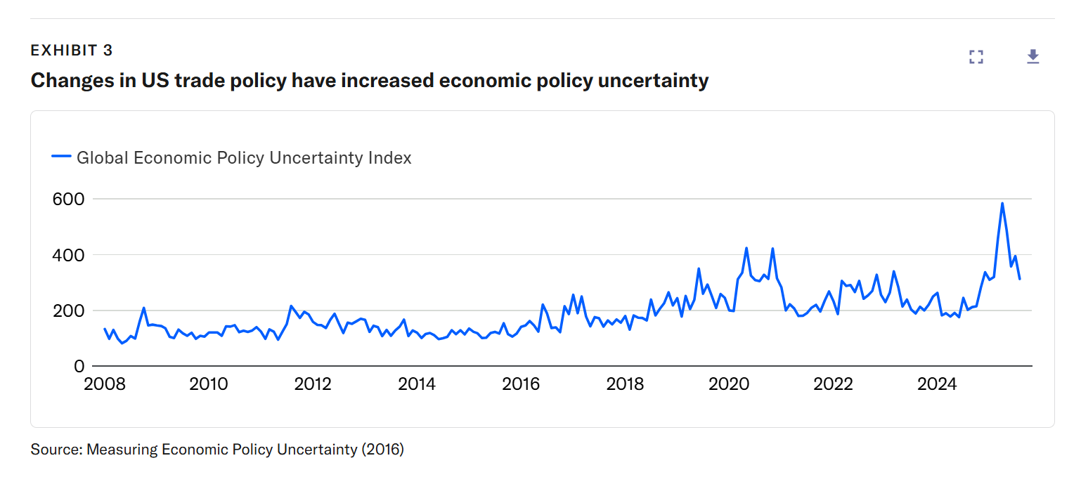 Υπάρχουν πολλοί κίνδυνοι, όπως γεωπολιτικές εντάσεις, πιθανές διαταραχές στο εμπόριο και στις αγορές. Μια διόρθωση στις αποτιμήσεις των εταιρειών τεχνολογίας θα μπορούσε να προκαλέσει σημαντική πτώση της αμερικανικής χρηματιστηριακής αγοράς. Οι γεωπολιτικές εντάσεις, οι διαταραχές στο εμπόριο και η πολιτική αστάθεια ενισχύουν την αβεβαιότητα. Οι αποκλίνουσες νομισματικές πολιτικές και οι ευάλωτες αγορές ομολόγων, που είναι επιρρεπείς σε περιόδους έντονης μεταβλητότητας, ενδέχεται να επιδεινώσουν τις χρηματοπιστωτικές αναταράξεις. Οι ραγδαίες τεχνολογικές εξελίξεις προσφέρουν αύξηση της παραγωγικότητας και μετασχηματιστικές επιπτώσεις σε όλους τους κλάδους, ακόμη και αν καταστήσουν ορισμένους τομείς και επαγγέλματα παρωχημένους.