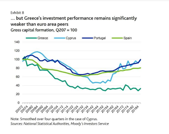 Τα περιθώρια τόνωσης των επενδύσεων είναι πολύ μεγάλα, δεδομένου ότι, όπως τονίζει ο οίκος, «η επίδοση της Ελλάδας στις επενδύσεις ήταν πολύ πιο αδύναμη συγκριτικά με άλλες χώρες της ευρωζώνης που βγήκαν από ύφεση και κρίση. Ο ακαθάριστος σχηματισμός παγίου κεφαλαίου στην Πορτογαλία και την Κύπρο ανέκαμψε στα προ κρίσης επίπεδα και στην Ισπανία σχεδόν στο 80%. Στην Ελλάδα βρίσκεται χαμηλότερα από το 1/3 των προ κρίσης επιπέδων».
