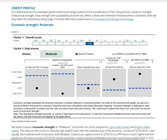 1. Η οικονομική ισχύς της Ελλάδας χαρακτηρίζεται «μέτρια» (“Moderate”) και ευθυγραμμίζεται με τη βαθμολογία της Κύπρου (Ba2 με σταθερές προοπτικές) και της Βουλγαρίας (Baa2 με σταθερές προοπτικές). Αυτό εξισορροπεί τα σχετικά υψηλά επίπεδα πλούτου της χώρας με το μέτριο μέγεθος της οικονομίας. Το κατά κεφαλήν εισόδημα στην Ελλάδα ανέρχεται στα 29.123 δολάρια και είναι σχεδόν τριπλάσιο από τον μέσο όρο των χωρών με βαθμολογία Β1 (10.176 δολάρια). Συγχρόνως, όμως, η αναπτυξιακή επίδοση της Ελλάδας είναι πολύ πιο ασταθής απ’ ό,τι εκείνη άλλων χωρών με βαθμολογία Β1 και μόλις πρόσφατα άρχισε να ανακάμπτει με ισχυρότερο ρυθμό.