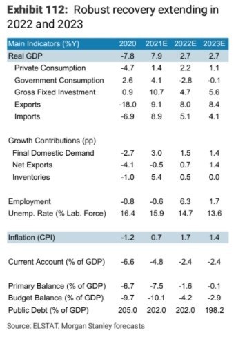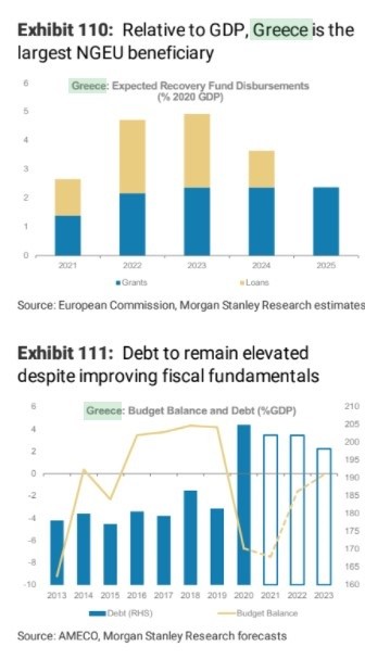 “Με τη βοήθεια του Ταμείου Ανάκαμψης, αναμένουμε ότι η ανάπτυξη θα αποκτήσει σε μια ισχυρή τάση. Παρ’ όλα αυτά, η φιλόδοξη κλίμακα του σχεδίου ανάκαμψης αναδεικνύει κινδύνους απορρόφησης πόρων”, σχολιάζει η Morgan Stanley στην ετήσια στρατηγική της για την Ελλάδα.