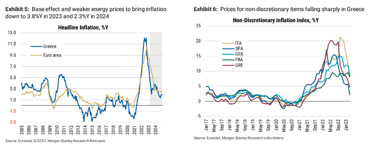 Αναφορικά με τον πληθωρισμό, η Morgan Stanley σημειώνει πως τώρα που οι τιμές του φυσικού αερίου βρίσκονται σε πτωτική πορεία, στην Ελλάδα συντελείται μια απότομη διόρθωση, με τον πληθωρισμό στο 4,6% ετησίως τον Μάρτιο. Όπως και στην υπόλοιπη Ευρωζώνη, μια διόρθωση στις τιμές των τροφίμων και της ενέργειας αναμένεται να οδηγήσει σε χαμηλότερο πληθωρισμό φέτος, από το 9,6% το 2022 στο 3,8% το 2023. Από την άλλη πλευρά, ο δομικός πληθωρισμός θα παραμείνει πιθανότατα αυξημένος, (όπως και στην υπόλοιπη Ευρωζώνη), κυρίως εξαιτίας των τιμών των υπηρεσιών αναψυχής, καθώς και των τιμών των ξενοδοχείων και των εστιατορίων, ενόψει μιας ακόμη ισχυρής τουριστικής περιόδου.
