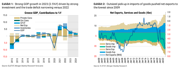 Όπως αναφέρει η αμερικανική τράπεζα, βλέπουμε αύξηση του πραγματικού ΑΕΠ κατά 2,5% το 2023 και 2,1% το 2024, χάρη στην πτώση του πληθωρισμού και την αύξηση του πραγματικού εισοδήματος, τη συνεχή στήριξη από την το Ταμείο Ανάκαμψης και Ανθεκτικότητας