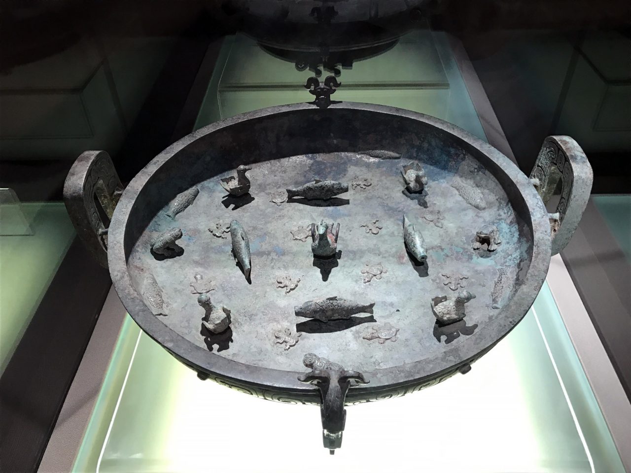 Τα δυο έργα που θα φιλοξενηθούν στο Μουσείο της Ακρόπολης είναι ξεχωριστά. Πρόκειται για μια χάλκινη τελετουργική λεκάνη του 7ου αι. π.Χ. που είχε κατασκευαστεί για την πριγκίπισσα Zi Zhong Jiang και χρησίμευε ως αγγείο νερού για το πλύσιμο των χεριών πριν από τις ιεροτελεστίες και τα συμπόσια. Η καινοτόμα διακόσμηση του σκεύους με σχηματοποιημένα ζωόμορφα μοτίβα και ειδώλια, μοναδική στα χάλκινα σκεύη της εποχής, καθιστά τη λεκάνη του Μουσείου της Σαγκάης ένα πραγματικά σπάνιο αριστούργημα της Κινεζικής χαλκοτεχνίας.