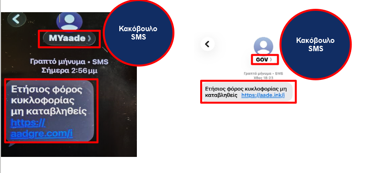 Τα μηνύματα αυτά, με την πρόφαση «μη καταβληθέντος ετήσιου φόρου κυκλοφορίας», ζητούν από τους παραλήπτες να πατήσουν σε σύνδεσμο (link) για να πληρώσουν δήθεν τέλη κυκλοφορίας οχημάτων.