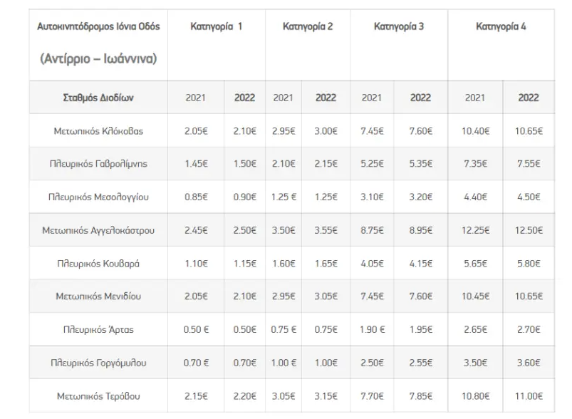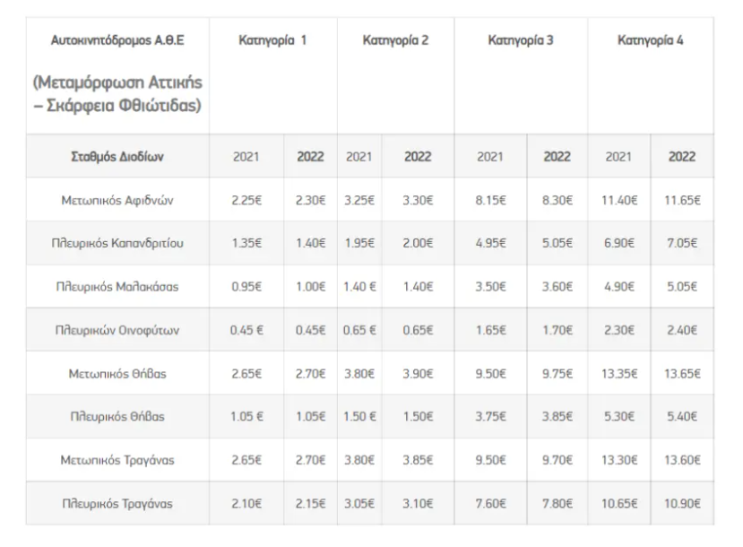Τα νέα τέλη παρουσιάζονται αναλυτικά ανά αυτοκινητόδρομο, σταθμό διοδίων και κατηγορία οχήματος στους παρακάτω πίνακες. Με κόκκινο χρώμα παρουσιάζονται οι τιμές που έχουν αυξήσεις από 0.05€ έως 0.30€ και με μαύρο χρώμα, παρουσιάζονται οι τιμές που παραμένουν αμετάβλητες σε σύγκριση με το 2021.