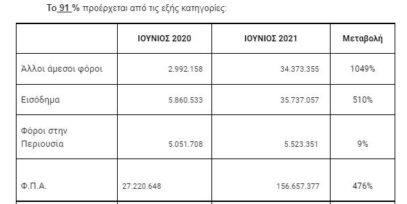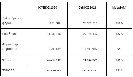 Σε ό,τι αφορά τις εισπράξεις 6μηνου, (εξαιρουμένων των μη φορολογικών κατηγοριών), έφτασαν τα 807εκ. € το 2021, ενώ την αντίστοιχη περίοδο το 2020 έφτασαν τα 526εκ € (αύξηση κατά 53%) .