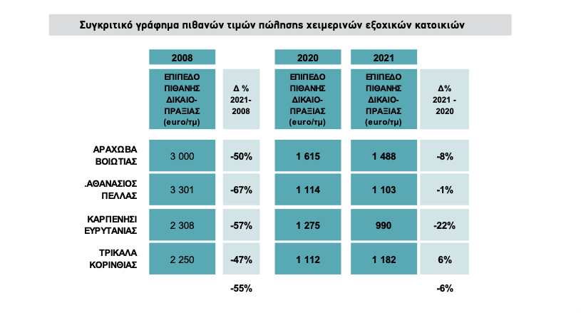 Όπως προκύπτει από τη μελέτη, καταγράφεται μικρή αύξηση των ζητούμενων τιμών πώλησης χειμερινών εξοχικών κατοικιών μόνο για τα Τρίκαλα Κορινθίας της τάξεως του 6% και μείωση για την Αράχωβα, το Καρπενήσι και τον Άγιο Αθανάσιο Πέλλας μέσης τάξης του 10,4%.