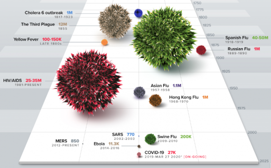 Η ιστοσελίδα visualcapitalist παρουσίασε όλες τις πανδημίες του παρελθόντος σε μια συγκριτική απεικόνιση.