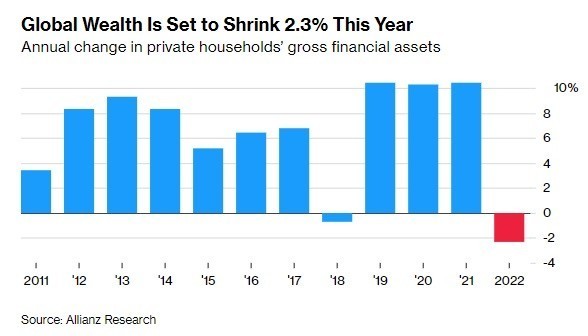 Την πρώτη καθίζηση από τη μεγάλη κρίση του 2008 αναμένεται να καταγράψει φέτος ο παγκόσμιος πλούτος των νοικοκυριών, ο οποίος είναι πιθανό να συρρικνωθεί κατά τουλάχιστον 2% μέσα στο 2022, όπως εκτιμάται σε ανάλυση της Allianz.