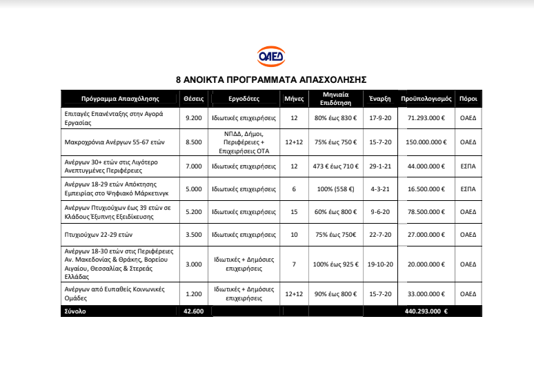 Οκτώ ανοικτά προγράμματα, συνολικού προϋπολογισμού 440 εκατ. ευρώ με 42.600 επιδοτούμενες νέες θέσεις εργασίας και επιχορήγηση του μισθού και των ασφαλιστικών εισφορών σε ποσοστό έως και 100% υλοποιεί ο ΟΑΕΔ.