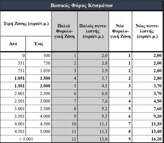 - για τιμή ζώνης από 751 έως 1.500 ευρώ/τ.μ. σε 2,80 ευρώ/τ.μ. αντί 3,70 ευρώ/τ.μ. που ισχύει σήμερα