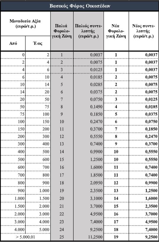 Πρώτο βήμα: Ο υπολογισμός του φόρου ανά τετραγωνικό μέτρο. Οι χαμηλότεροι συντελεστές του βασικού φόρου κτισμάτων διαμορφώνονται, ενδεικτικά, ως εξής: