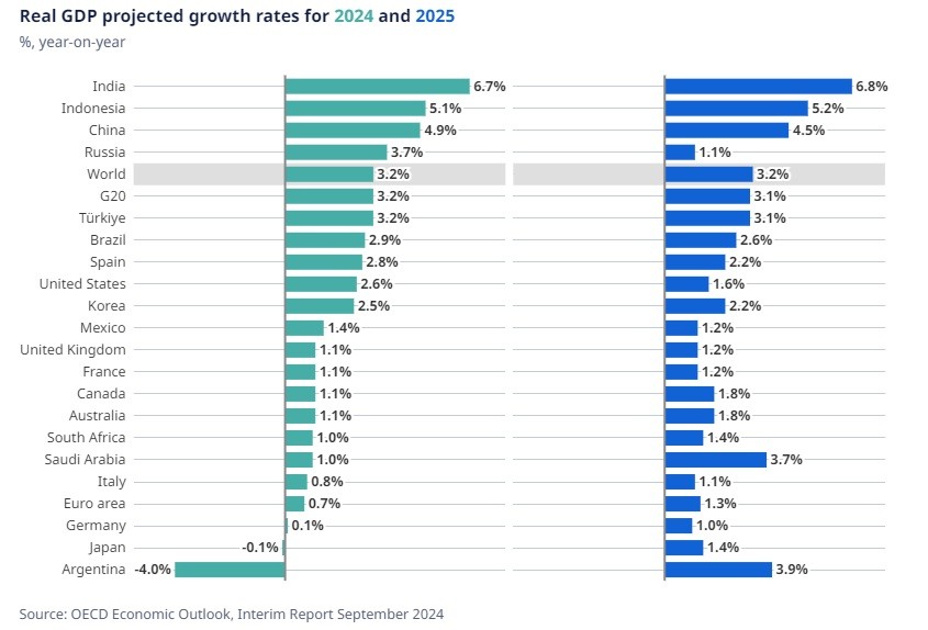Στο 3,2% αναμένεται να σταθεροποιηθεί η παγκόσμια ανάπτυξη τόσο το 2024 όσο και το 2025, σύμφωνα με τον Οργανισμό Οικονομικής Συνεργασία και Ανάπτυξης (ΟΟΣΑ).