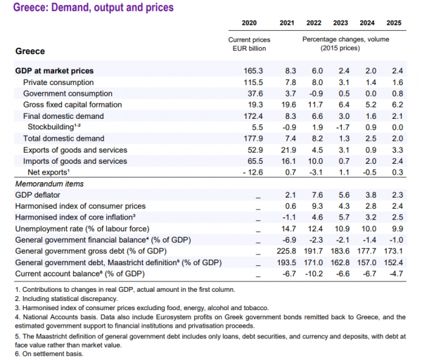 Η Ελλάδα αναμένεται να επιτύχει αυξανόμενα πρωτογενή πλεονάσματα, σημειώνει η έκθεση, από 1,1% του ΑΕΠ το 2023 στο 2,1% το 2025, κάτι που θα συμβάλει στην ταχεία μείωση του δημόσιου χρέους από 163% του ΑΕΠ φέτος στο 152% το 2025.
