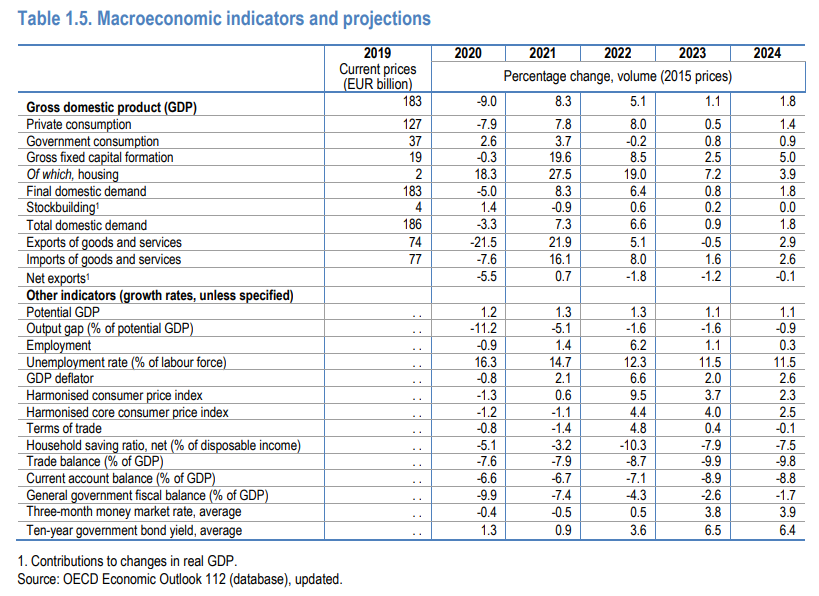Σύμφωνα με τις προβλέψεις του ΟΟΣΑ, μεγάλη θα είναι το 2023 και η πτώση στον ρυθμό ανάπτυξης της χώρας, που εκτιμάται στο 1,1% φέτος και 1,8% το 2024 από 5,1% το 2022.