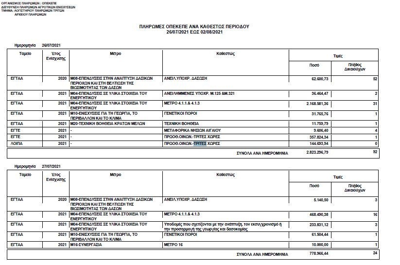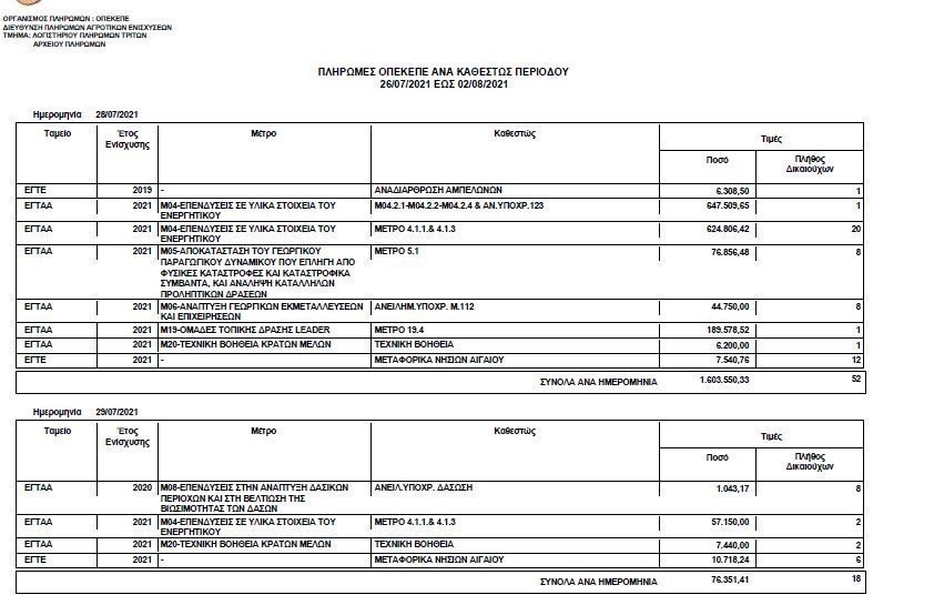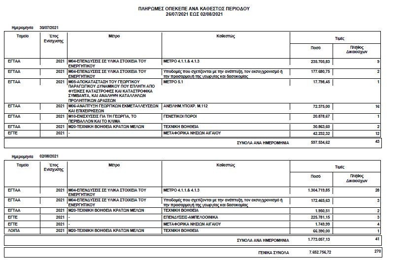 Συγκεκριμένα, ο οργανισμός το διάστημα από τις 26/07/2021 έως τις 02/08/2021 κατέβαλε σε 270 δικαιούχους το ποσό των 7.652.756,72 ευρώ.