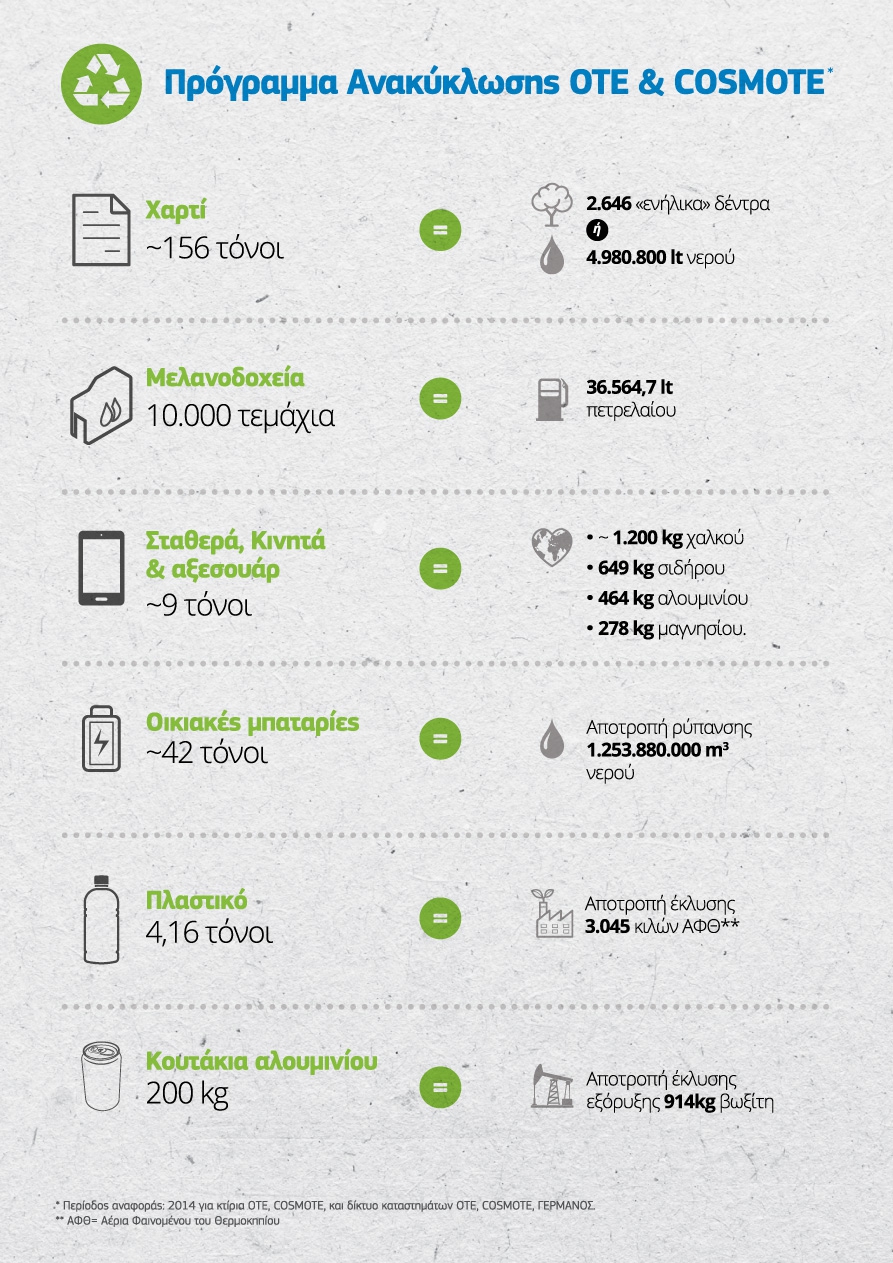 Περισσότεροι από 60 τόνοι ανακυκλώσιμων υλικών1 συγκεντρώθηκαν το 2014 στο πλαίσιο του προγράμματος ανακύκλωσης ΟΤΕ–COSMOTE, που υλοποιείται τόσο σε κτίρια όσο και στα καταστήματα του Ομίλου με τη συμμετοχή εργαζομένων και πελατών.