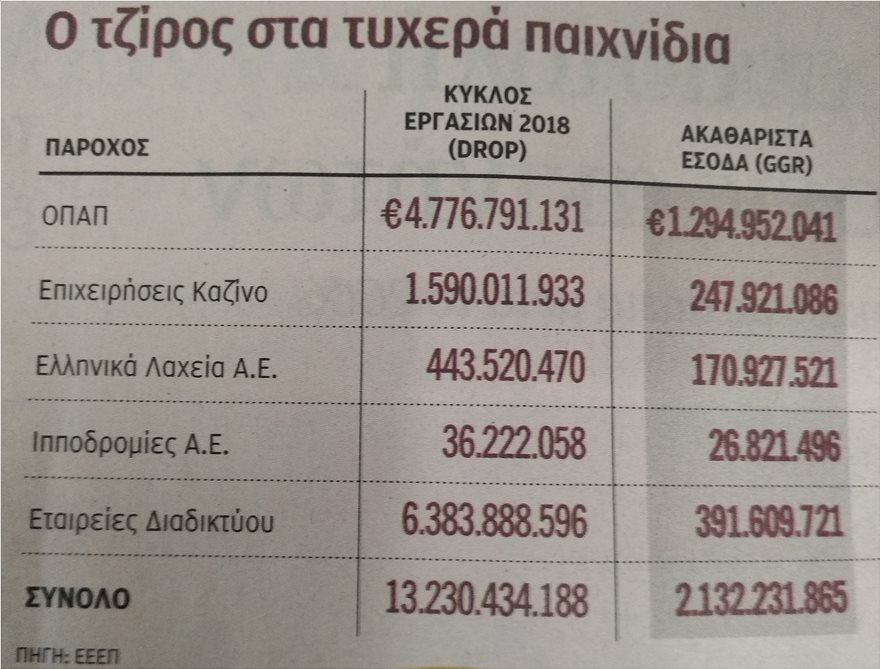 Από το συνολικό ποσό, τα 13,2 δισ. είναι χρήματα που παίχτηκαν σε πρακτορεία του ΟΠΑΠ, σε καζίνο, σε λαχεία, σε ιπποδρομίες και σε τζόγο μέσω διαδικτύου.