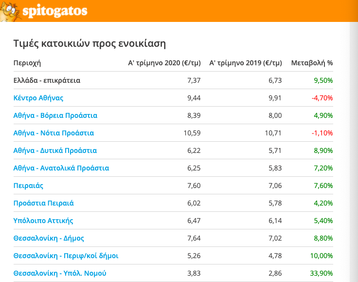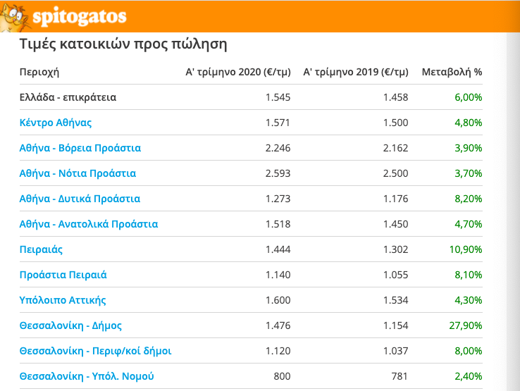 Τώρα, με βάση τα στοιχεία από το δίκτυο του Spitogatos, της γνωστής ιστοσελίδας αγγελιών ακινήτων, με πάνω από 2 εκατομμύρια μηνιαίους επισκέπτες που βλέπουν περισσότερες από 80 εκατομμύρια σελίδες το μήνα, κατά τη διάρκεια του Ιανουαρίου-Φεβρουαρίου-Μαρτίου 2020, πανελλαδικά σημειώνεται σημαντική αύξηση στις τιμές των κατοικιών σε σύγκριση με το αντίστοιχο διάστημα πέρυσι.