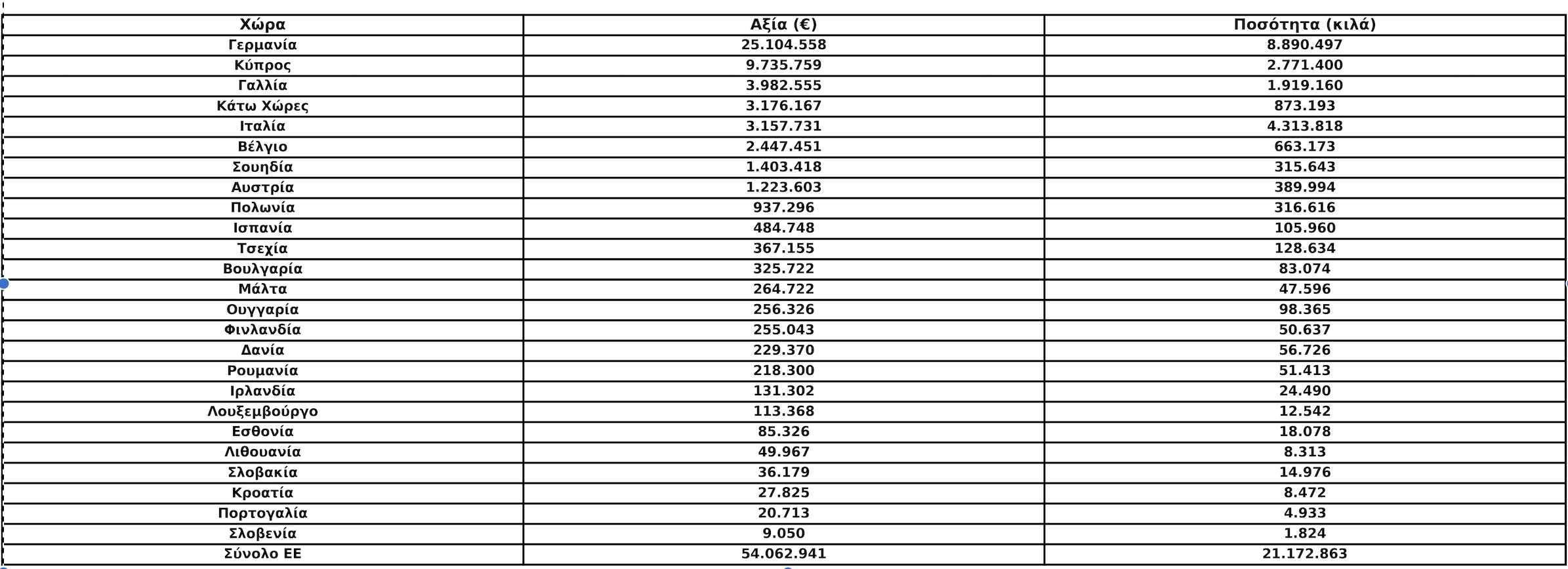Σε επίπεδο αξίας, οι εξαγωγές προς την ΕΕ κατέγραψαν ήπια άνοδο 1,07%, διαμορφούμενες στα 54.062.941 ευρώ το 2025 από 53.487.991 ευρώ το 2024. Σε σχέση με τον μέσο όρο της προηγούμενης πενταετίας, η αύξηση φτάνει το 2,99%.