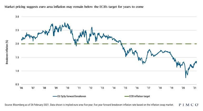 Σε ό,τι αφορά το ΑΕΠ της Ευρωζώνης η Pimco εκτιμά ότι θα επιστρέψει σε προ- πανδημικά επίπεδα το 2022, όχι φέτος. Με τέτοιους αργούς ρυθμούς επιστροφής στην κανονικότητα, αναμένει ότι ο πληθωρισμός θα παραμείνει χαμηλός και θα αυξηθεί μόνο σταδιακά τους επόμενους 12 με 18 μήνες.