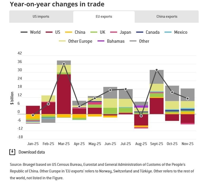Παρά τις ασταθείς και τελικά χαμηλότερες εξαγωγές της ΕΕ προς τις ΗΠΑ , οι συνολικές εξαγωγές της ΕΕ το 2025 αυξήθηκαν σε ετήσια βάση. Οι εξαγωγές προς άλλους προορισμούς (ιδίως το Ηνωμένο Βασίλειο, τη Νορβηγία, την Ελβετία, την Τουρκία και τον υπόλοιπο κόσμο) υπεραντιστάθμισαν τη μείωση των εξαγωγών προς τις ΗΠΑ.