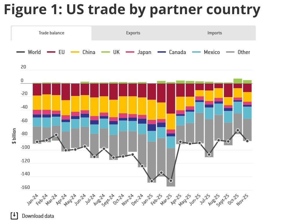 Μέχρι τον Νοέμβριο του 2025, οι συνολικές εξαγωγές της ΕΕ προς τις ΗΠΑ ήταν περίπου 4% χαμηλότερες από το επίπεδό τους ένα χρόνο νωρίτερα.