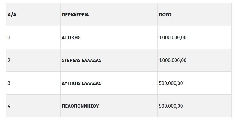 Στο πλαίσιο του ολιστικού πλάνου αντιπλημμυρικών παρεμβάσεων και αποκατάστασης φυσικού περιβάλλοντος που αποφασίστηκε από την Κυβέρνηση, καθώς και της συνεργασίας με τον Υφυπουργό στον Πρωθυπουργό αρμόδιο για θέματα κρατικής αρωγής και αποκατάστασης από φυσικές καταστροφές, κ. Τριαντόπουλο, τον Υφυπουργό Περιβάλλοντος και Ενέργειας, κ. Αμυρά, και τους αρμόδιους Περιφερειάρχες για τις Περιφέρειες της χώρας οι οποίες επλήγησαν από τις πυρκαγιές, με απόφαση του Αναπληρωτή Υπουργού Εσωτερικών, Στέλιου Πέτσα, κατανέμεται στις πληγείσες Περιφέρειες συνολικό ποσό ύψους 3 εκατ. ευρώ ως εξής: