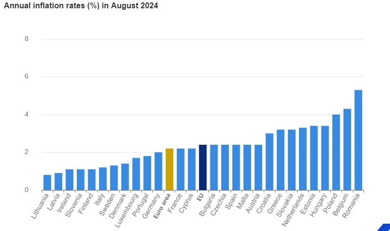 Ενίσχυση του πληθωρισμού στο 3,2% τον Αύγουστο από 3% τον Ιούλιο, σύμφωνα με τα στοιχεία της Eurostat. Τον Αύγουστο του 2023 ο πληθωρισμός ήταν στο 3,5%.
