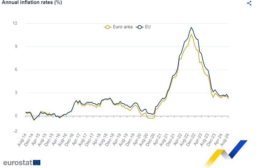 Ο ετήσιος ρυθμός πληθωρισμού στην ευρωζώνη ήταν 2,2% τον Αύγουστο του 2024, από 2,6 % τον Ιούλιο και 5,2% ένα χρόνο νωρίτερα, σύμφωνα με τα τελικά στοιχεία που ανακοίνωσε σήμερα η ευρωπαϊκή στατιστική υπηρεσία Eurostat.