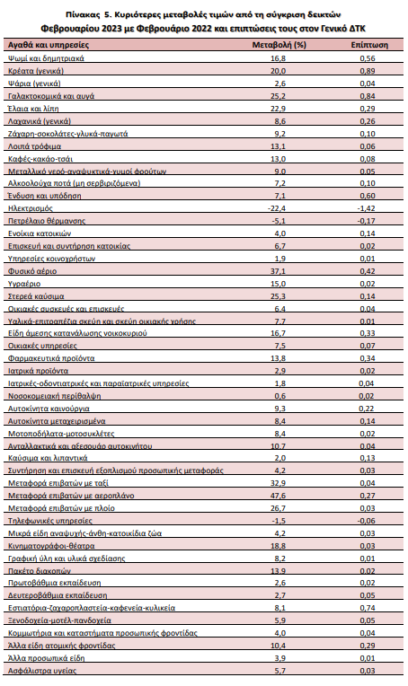 Η αύξηση του Γενικού ΔΤΚ κατά 6,1% τον μήνα Φεβρουάριο 2023, σε σύγκριση με τον αντίστοιχο Δείκτη του Φεβρουαρίου 2022, προήλθε κυρίως από τις μεταβολές στις ακόλουθες ομάδες αγαθών και υπηρεσιών: