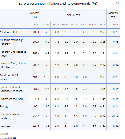 Εξετάζοντας τις κύριες συνιστώσες του πληθωρισμού της ζώνης του ευρώ, οι υπηρεσίες αναμένεται να έχουν τον Ιούνιο τον υψηλότερο ετήσιο ρυθμό (4,1%, σταθερό σε σχέση με τον Μάιο), ακολουθούμενες από τα τρόφιμα, το αλκοόλ και τον καπνό (2,5%, έναντι 2,6% τον Μάιο), τα μη ενεργειακά βιομηχανικά αγαθά (0,7%, σταθερό σε σχέση με τον Μάιο) και την ενέργεια (0,2%, έναντι 0,3% τον Μάιο).