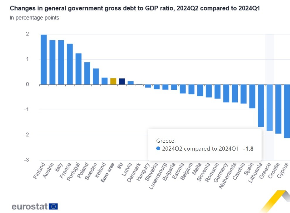 Ο πρώτος λόγος ήταν ότι την ίδια στιγμή η Eurostat ανακοίνωνε ότι, ακόμα και μετά την προσθήκη των αναβαλλόμενων τόκων, το 2024 (β΄ τρίμηνο) η Ελλάδα είχε την 2η μεγαλύτερη μείωση χρέους στην Ευρωζώνη.